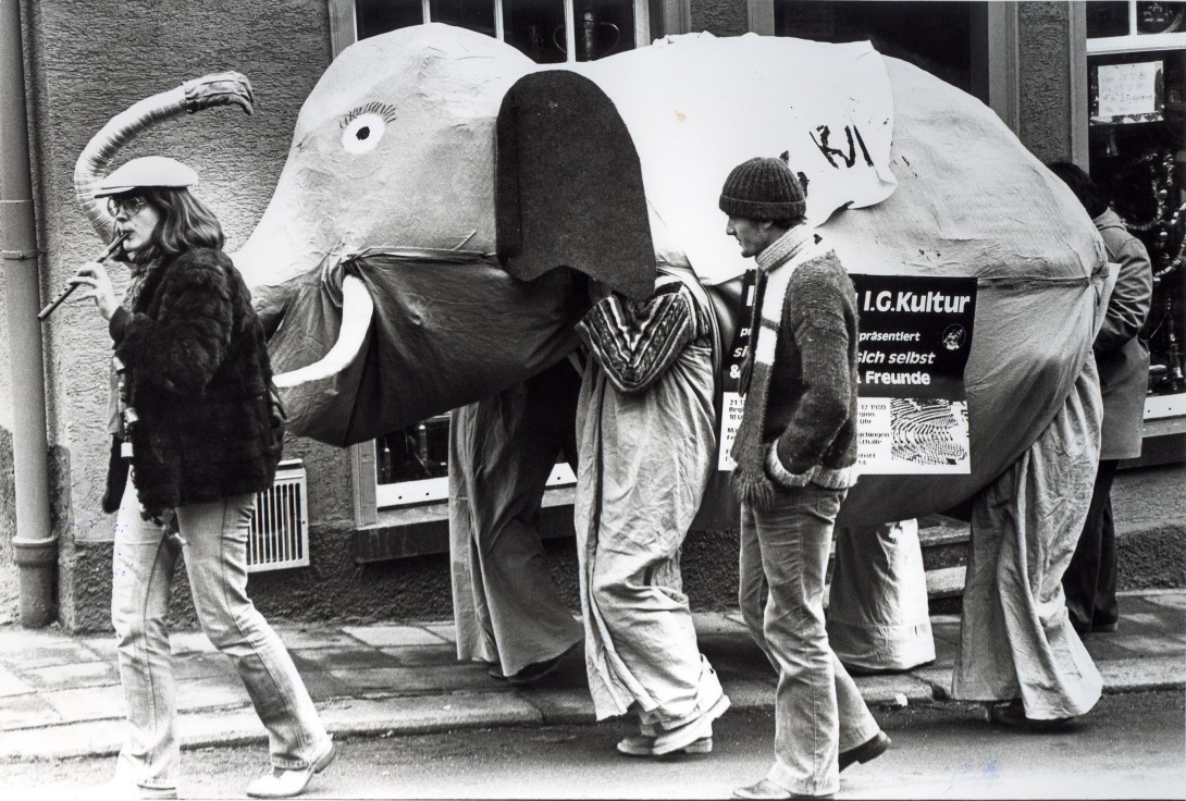 Am 02.12.1980, im Jahr der Gründung der IG Kultur, wird hier auf ungewöhnliche Art und Weise Werbung für den Verein gemacht. Der Elefant wurde schon früh als Symbol für die IG Kultur verwendet. Ein Elefant ist stark, aber auch sensibel, er ist sympathisch und hilfsbereit, aber vergisst auch nichts.